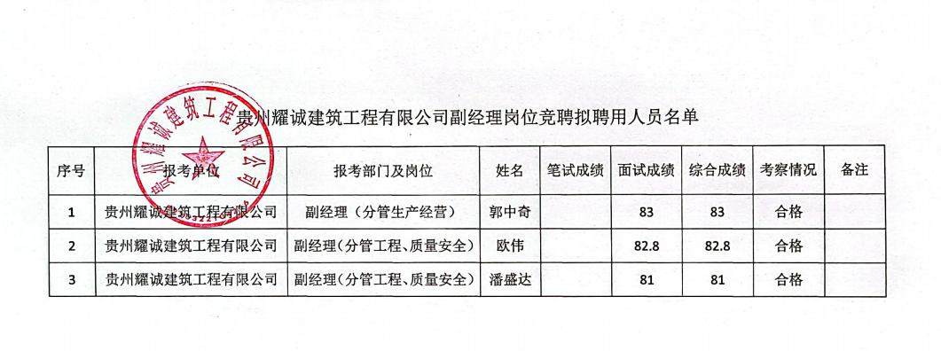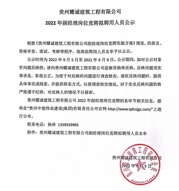 貴州耀誠(chéng)建筑工程公司2022年副經(jīng)理崗位競(jìng)聘擬聘用人員公示